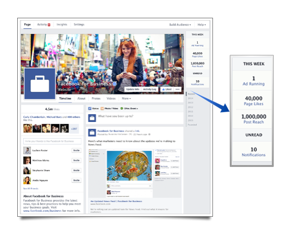 This Week – This is my favorite feature of the page. This Week gives you a very quick overview of your page for the week. It lists any ads you have running, how many likes you received, post reach and any unread notification. This is only available to admins so your fans won’t see it.