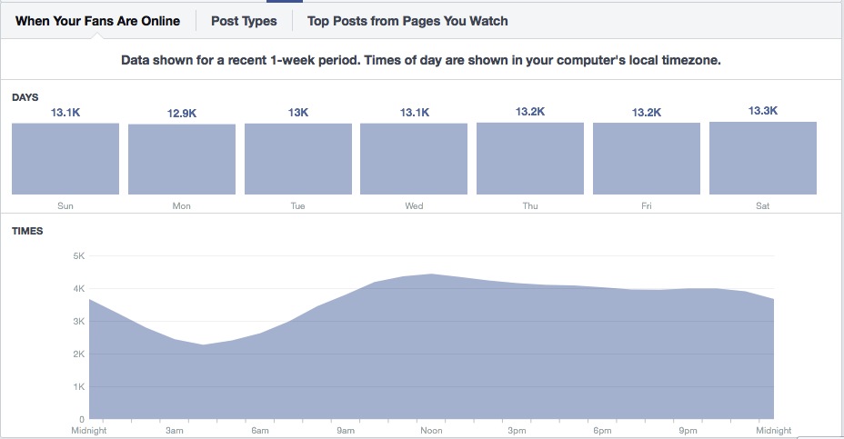 This is one of the analytics I use the most for all my clients. This not only breaks down when your fans interact with you through out the day, but also which days are better. When they first released this it was one of the best things analytic tools they offer. The reason is you don’t want to post when your fans aren’t online. You want to post when you can reach the most people and the days they are most active. I would check this at least monthly to make sure there is no change in your fans habits.