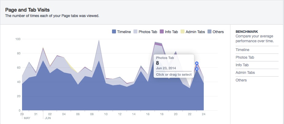 If you have multiple tabs this is going to be one of the most important analytics. This is especially true if you have paid for tabs. This will tell you how many visits you get to the Timline (aka feed), and each tab will be listed in the graph. This is important if you have paid for tabs from third party vendors. You want to make sure that your fans are actually visiting the tabs. If they are not you will need to rethink your tab strategy. There is no need to pay for a tab that no one is interacting with on a significant basis.