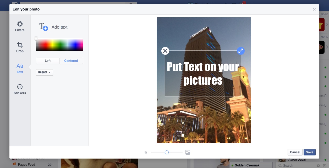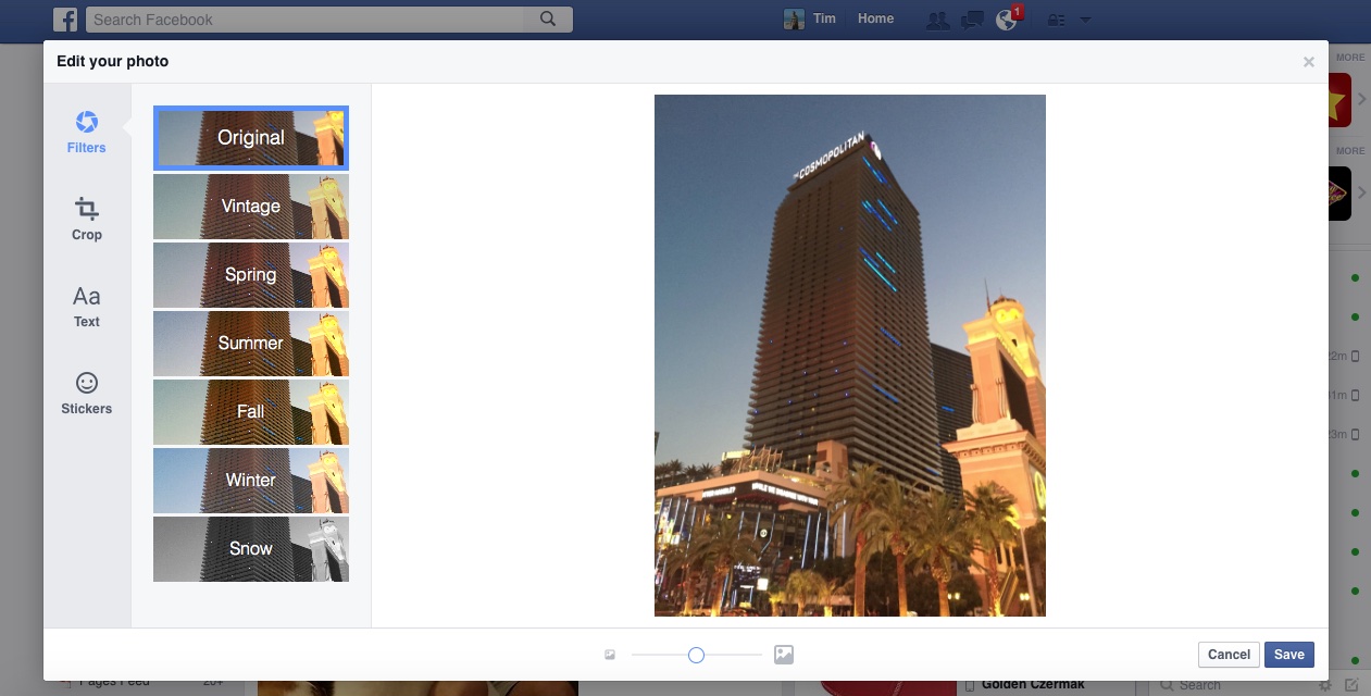 Facebook has finally rolled out photo editing on the web! If you have used the service on mobile you may have seen these features. Its really surprising that they haven’t released these before now. Google+, Twitter and other social sites have rolled out filters and the ability to edit photos. Note, this has yet to roll out to pages. I’m pretty confident they will enable this functionality. Usually pages take a back seat to the consumer side.