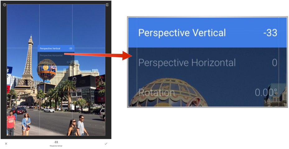 Rotate can be used in two ways. The first way is if you took a photo and it’s a vertical picture (Portrait) but showing in Horizontal (Landscape). By clicking the rotate left or right will rotate the image 90 Degrees. If you choose the second, Manual Rotation. Hold your finger on the screen and you can rotate up to 45 degrees either way. This is great for having a photo that is slightly off.