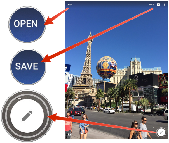 Once you select your photo. You will be in the main edit screen. It took me a minute to figure this out from the upgrade. To edit the image you have to touch the Pencil Icon (white circle with the pencil inside). If by chance you opened the wrong picture, touch the “Open in the top left of the screen. After you get done editing touch “Save” to save the photo to your library. You can save the image or save as. I recommend Save As because you May want to reedit the image later.