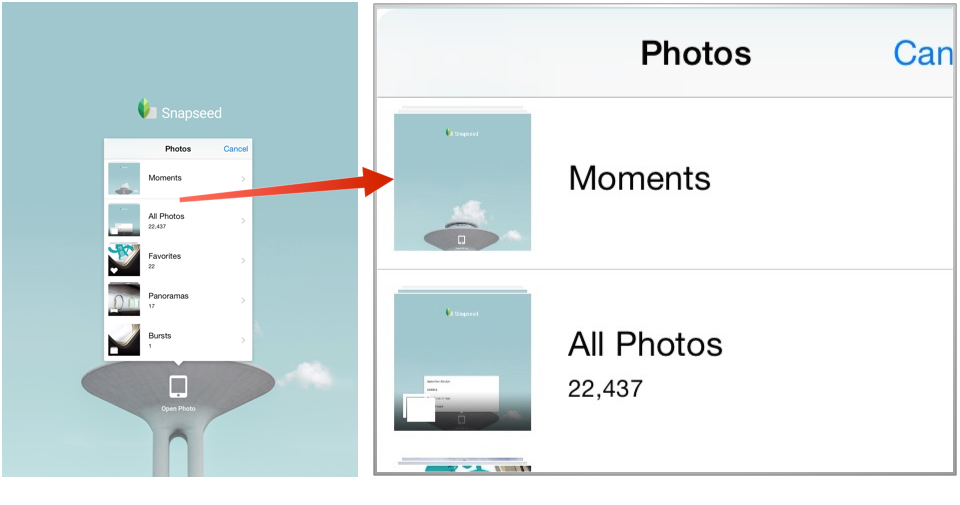 If you choose the Open From Device. In iOS you will bet a list of places to open a photo. Moments are your photos minus hidden pictures. All Photos are just that all photos. Favorites are ones you have marked as favorites. The list goes on. On Android you should have similar settings and folders.