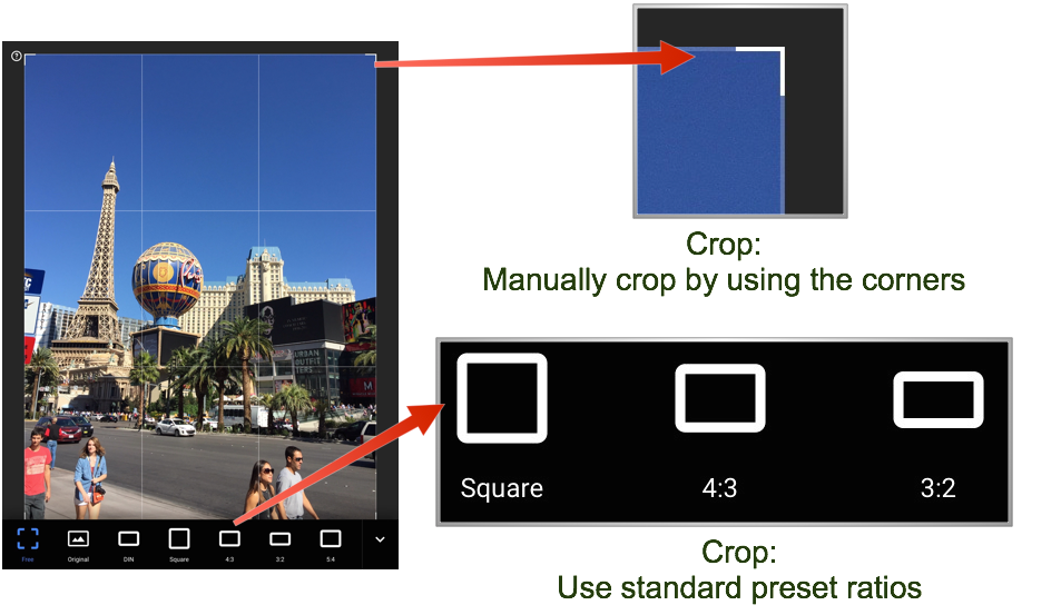 Crop is the most used feature for me in this App. There are many times you have an image but if only you could cut out part of the photos. The App has a lot of presets that will save you time. They include Square (1:1), 3:5, 4:3 and 16:9. This will automatically have a preset crop box on the screen. The parts in color are what will show and the greyed out area will be cut. If, you want to crop it to any size. Just drag the corners with the bold white lines to manually resize. In any screen touch the Check mark to accept and the X to reject and start over