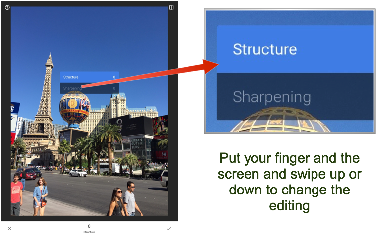 After you touch the edit button. You will have a screen of Tools and Filters. For this tutorial I’m just sticking with the Tools. There will be another tutorial on the Filters in the next few weeks. One thing to know about most of the tools. If you touch your finger to the screen and drag it up or down. You will be able to change the tool you edit will. Just make sure your finger is on the screen as you drag it.