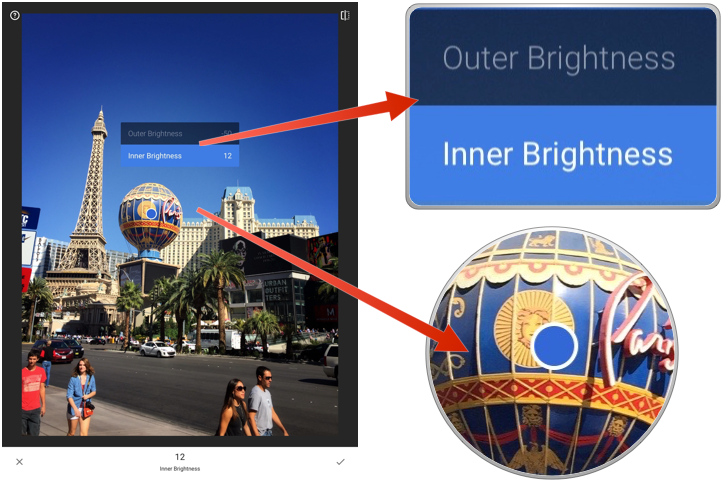 Is a really cool feature. It creates a circle and you can adjust the inner brightness or outer brightness. This will allow you to highlight parts of the picture. By default the blue dot first appears in the center of the screen. The dot can be drug anywhere around the picture and placed where you want it. Its not something I use often but can come in handy.