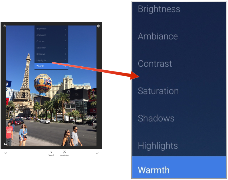 As I said this App has many of the features of Photoshop. They include Brightness, Ambiance, Contrast, Saturation, Shadows, Highlights and warmth. The ones I use the most are Brightness and Shadows. If you haven’t manually adjusted a photo in another app. Its going to take some experimentation for you to get pictures right. If these options are just too much for you there is an Auto Adjust at the bottom. It will automatically make the picture the best as determined by the App. Sometimes it makes it better and sometimes it doesn’t. Just be ready to experiment with the other features if it’s a fail with Auto Adjust