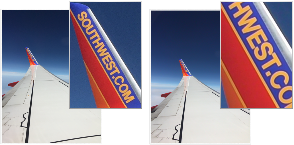 The picture on the right is the regular 8 MP picture, As you can see the image is blown up to maximum size and you can see the winglet is a little grainy. The image on the right is done on High Res with Hydra. Note you can enlarge the image a lot more. Its also smoother with less grainy appearance.