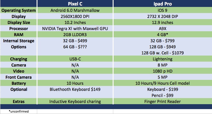 Who are the consumers of each tablet? It is my opinion that Apple is going directly after business. In the September Keynote they had a focus on healthcare. It is a market they want to be involved in. Also, the new pencil and screen are aimed at artists. The Pixel C is aimed more at consumers, I feel. I think they are also testing how to get Android into the business environment.