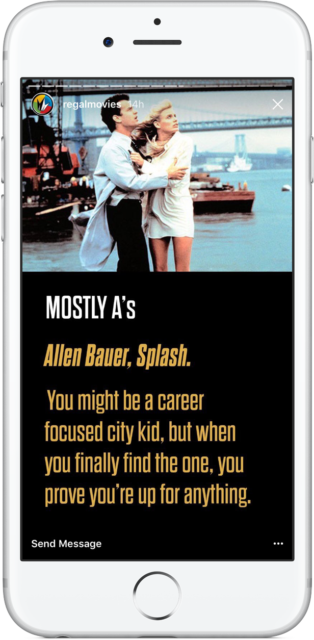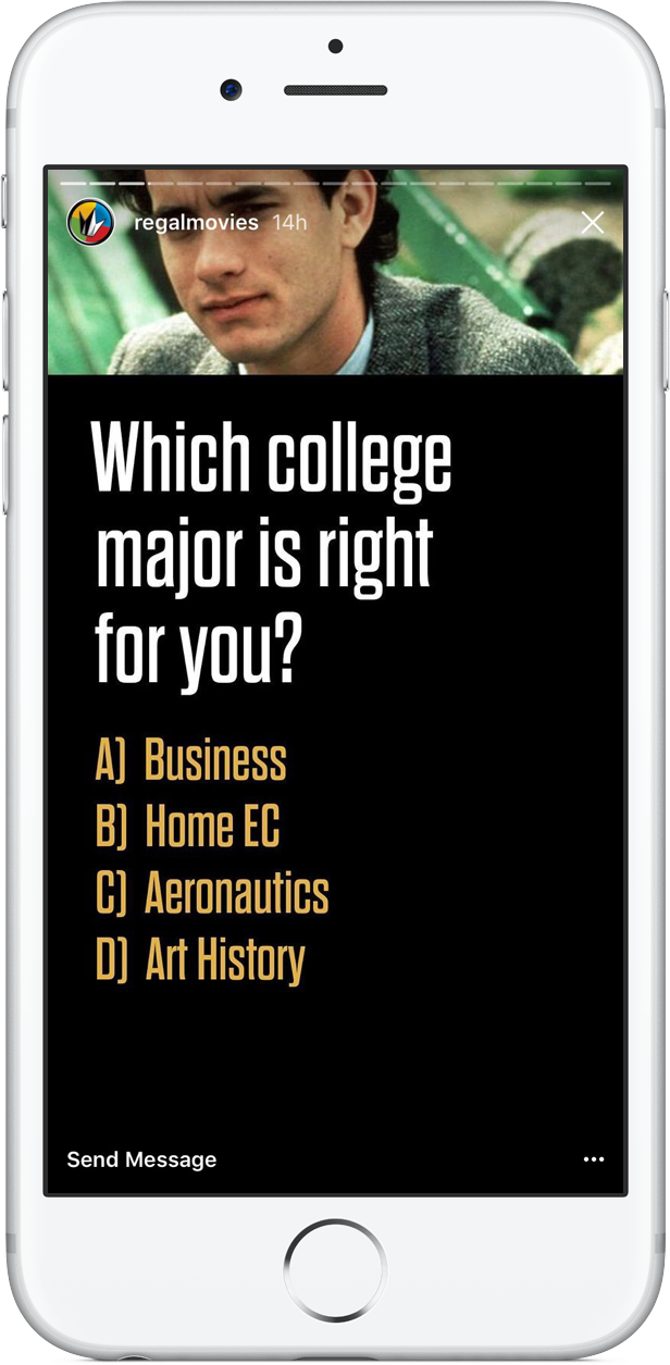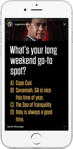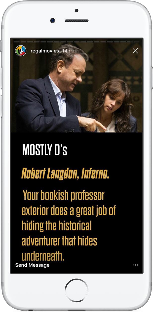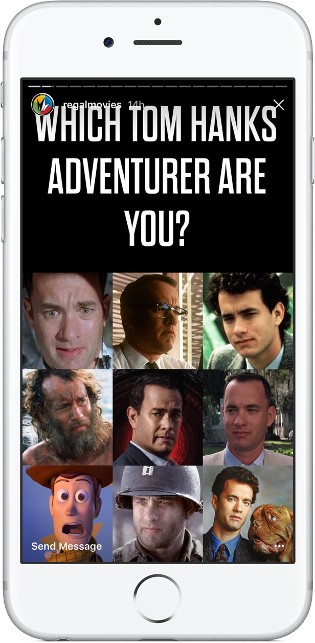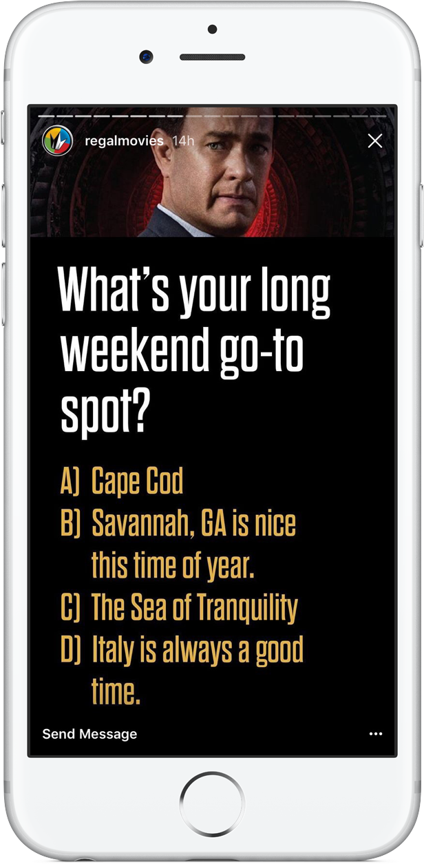 Two brands doing the second option are Regal Cinemas and HBO. Each went about it in different ways. The first company I saw using Instagram Stories in a new way was Regal Cinemas. They did a quiz. It may sound odd but it actually worked. It was focused around Tom Hanks, since his new movie in the Da Vinci Code series is being released this holiday. Here is what they did: