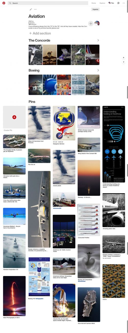 As you can see I have an aviation board. I love Boeing, the Concorde, and Space travel. My pins of the Concorde always get repins. So I had a chance to group all the Concorde pins in one area. The rest of the pins on the board show up below the sections.