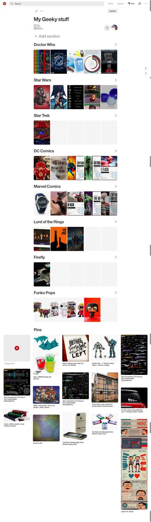 My Geek Board shows it a lot better. I have it divided into show/movies. It’s still on the geek board. I’m waiting to hear how this does with SEO in social. This will come helpful in business social media. The boards can be a product line and the sections can be products. Or, if you have a product, projects, and printables. It will depend on your own goals for social.