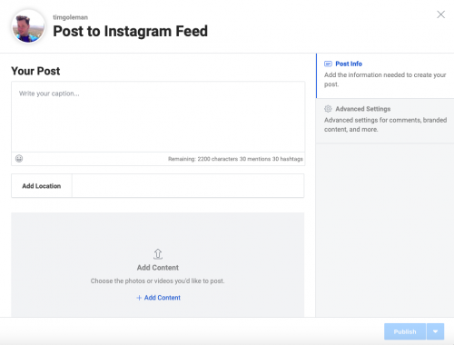 Instagram is easy to schedule in Creator Studio. Enter your text under “Your Post” then if you want a location enter it at “Add Location” and upload your pictures or videos. After they are uploaded you can tag and do everything you would do on the app. One thing I love about Creator Studio is when you tag someone you can see if it’s the right IG account. You schedule this the same way you do with Facebook.