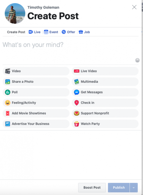 The above window should look familiar. After you head to the Creator Studio (https://business.facebook.com/creatorstudio) and under the Facebook tab, you will see a blue “Create Post” button in the top left. Click it and this comes up. You simply fill it out like you would on Facebook and click the down arrow next to Publish and schedule your post.
