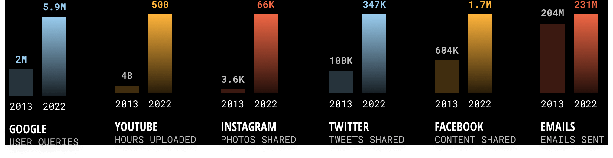 Go to the Domo Every Minute Pate to see more of the comparisons of the data from 2012 to 2022 data.