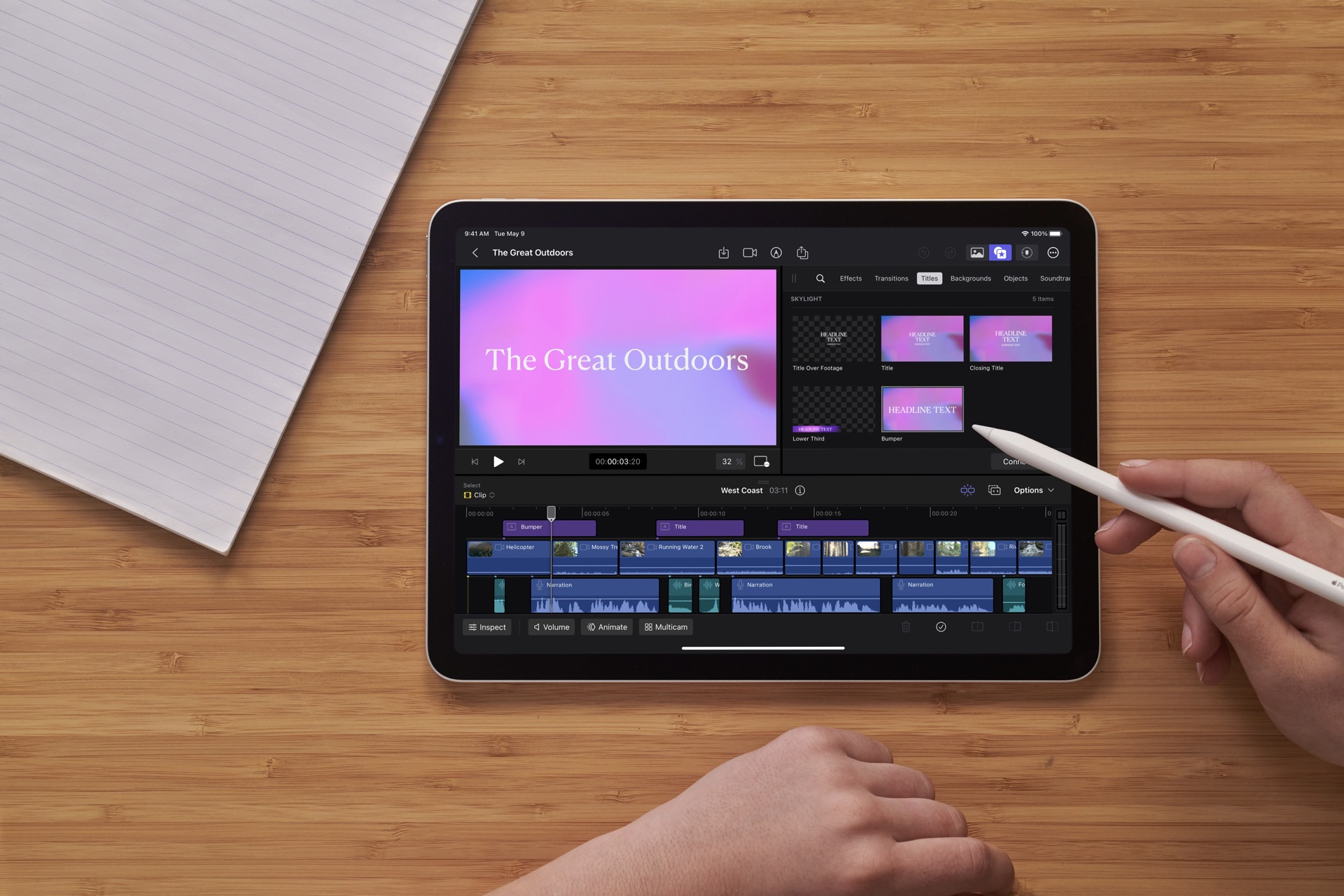 Final Cut Pro for iPad offers a vast library of professional graphics, effects, and audio to enhance your storytelling. From stunning HDR backgrounds to customizable animated patterns and professional soundtracks that automatically adjust to the length of your video, you have a wealth of creative resources at your disposal.